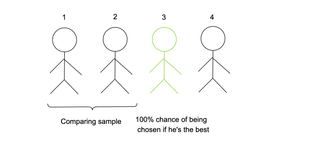 If from the n candidates we choose say the candidate i and he/she was better than the i-1 before candidates we can can say that the bigger the i the more probable is that we have chosen the best candidate.