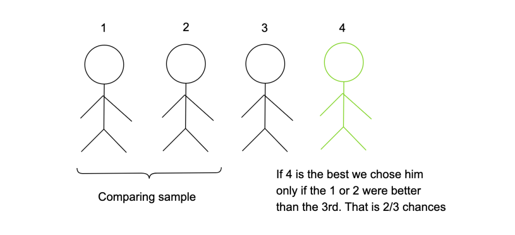 Ofcourse the problem formulation is really constrained and a real life scenario like this it’s highly utopic. Usually you can just call the first after all of them if you felt he/she was the first. Nevertheless I think the problem solution is pretty elegant and highlights that sometimes things can be approached in clever ways and they deliver quite better outcomes than without any thinking on them. A probability of at least 0.36.. no matter the number of applicants is high and not what one thinks when he is first presented the problem.